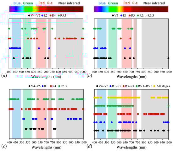 When gathering the development stages with similar characteristics from the 2017 to 2020 crop seasons (Figure 5d), 44 wavelengths were selected at V4–V5, 26 at R1–R2, 44 at R3–R4, and 44 at R5.1–R5.3. Once again, most of the selected wavelengths were located in the Vis spectrum, red (620 ≈ 700 nm), green (500 ≈ 570 nm), and blue (420 ≈ 500 nm). For the red-edge and NIR spectrum, V4–V5 and R3–R4 showed a larger number of selected wavelengths compared to the other stages: 11 wavelengths at V4–V5 and 22 at R3–R4.