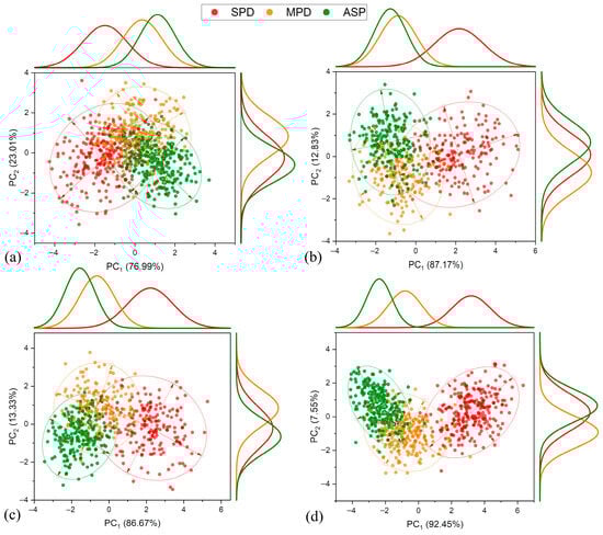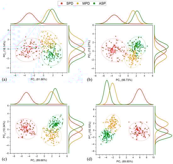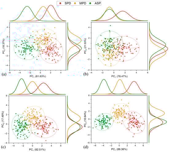 Figure 6 shows the results from the 2017–2018 crop season. During the V4–V5 development stage (Figure 6a), the ASP treatment stood out from the others, while the MPD and SPD treatments overlapped slightly in PC1. In PC2, MPD was separated from the ASP and SPD, but there was no distinct clustering between SPD and the ASP in this component. Conversely, at the reproductive stage R2 (full bloom), only SPD could be separated from the other treatments in PC1, with no clustering tendency noted between the ASP and MPD. For PC2, there was no possibility of separating the ASP and MPD, but a minor clustering tendency was observed for the ASP relative to MPD. Furthermore, stage R2 showed the most data overlap of all the evaluated stages in this crop, contributing to the overall lower performance of the PCA compared to the other stages. Soybean plants during stages R4 and R5.3 intensify the absorption, accumulation, and reallocation of K+ to the grains, which can lead to K+ deficiency. The ASP, MPD, and SPD exhibited separation in PC1 and PC2 at these stages. They also showed the highest proportions of data variance explanation (82.51–89.36%, respectively) compared to V4–V5 and R2, coinciding with the complete filling and ripening of the grains in the pods.