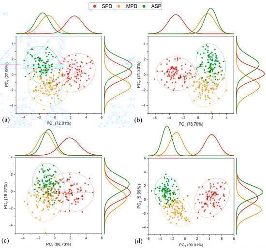Principal component analysis was applied to verify the existence of treatment separability by the full spectral curve and the possible formation of isolated clusters or overlaps among treatments via two-dimensional plots of the first component (PC1) vs. the second component (PC2).