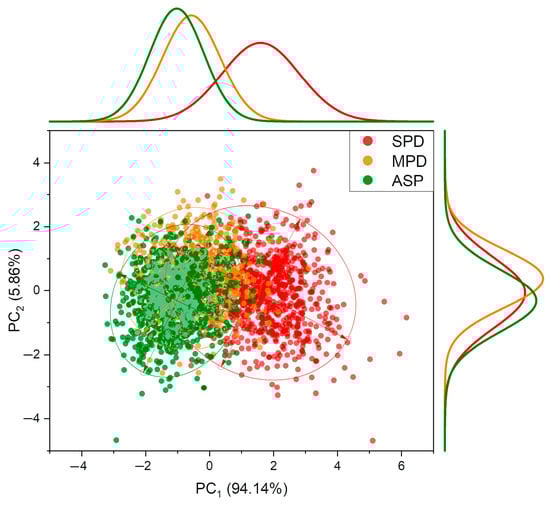 Finally, when combining all soybean crop seasons (2017–2018, 2018–2019, and 2019–2020) and all stages of development (Figure 10), the frequency distribution of PC1 reveals a separation of the treatment with a severe K+ deficiency (SPD) from the others. However, no clear separation trend for the ASP and MPD treatments could be identified within this component. For PC2, which has a lower accumulated variance, a separation of treatments could not be achieved. However, a slight tendency for MPD to separate from the other treatments could be observed. Despite the limited separation of treatments, these results indicate that it is possible to identify K+ deficiency, regardless of the cultivation year and the developmental stage of the plants.