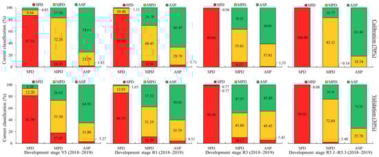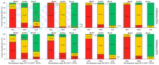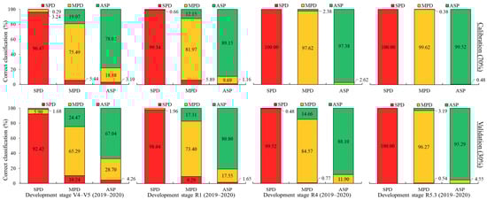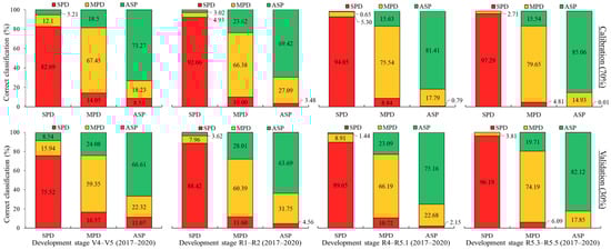 When all the crop seasons with similar development stages were gathered in a new dataset, the results showed values of 74.17% for V4–V5 in the simulation stage and 66.84% in the external validation stage. For R1–R2, the values were 75.61% (simulation) and 70.08% (external validation). In the R3–R4 stage, the values were 83.45% (simulation) and 76.78% (external validation). In the R5.1–R5.3 development stage, classification accuracies of 87.18% (simulation) and 83.83% (external validation) were achieved.