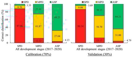 The LDA models effectively discriminated between the treatments under study, achieving an overall accuracy rate greater than 75%. For the model’s simulation and external validation stages, accuracy rates above 70% and 59% were achieved, respectively. SPD had the highest discrimination rate in all development stages and combinations evaluated. Misclassification rates were higher in earlier development stages for MPD and the ASP but decreased when the plants reached reproductive stages.