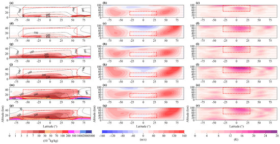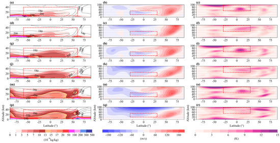 It is illustrated that during the southern spring, the equatorial amplitude maxima of DW1 are located around 70 km, with smaller non-equatorial maxima at high latitudes at the same altitude (Figure 1). The seasonal variation in the height of the amplitude maxima of DW1, as observed in the MCS data (Wu et al. [42]), is reproduced by the model, with the springtime maxima in the Southern Hemisphere (Figure 2i) being lower than the summertime maxima (Figure 1i). Additionally, the modeled distribution of dust aligns well with observations. At Ls = 180°–210° and 270°–300°, dust development in the Southern Hemisphere reaches higher altitudes compared to the Northern Hemisphere (Figure 1g and Figure 2g), the latter experiencing more vigorous growth due to stronger solar radiation. Our findings also indicate that under a ‘warm’ dust background (Figure 1m,p), regardless of the presence of gravity waves, the average dust mass mixing ratio can reach nearly 5 × 10−6 kg/kg at 40 km altitude. The dust reaching the upper levels of the tropical troposphere imposes significant thermodynamic forcing on the circulation and tidal patterns, as supported by [43,44].