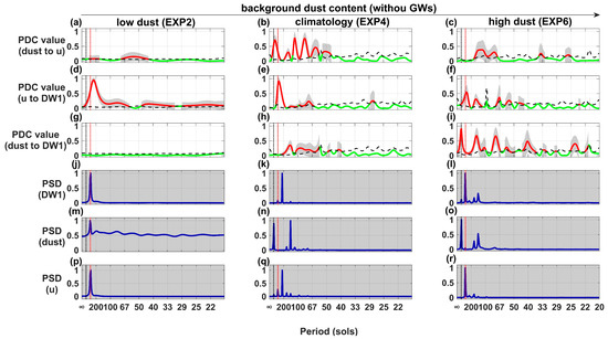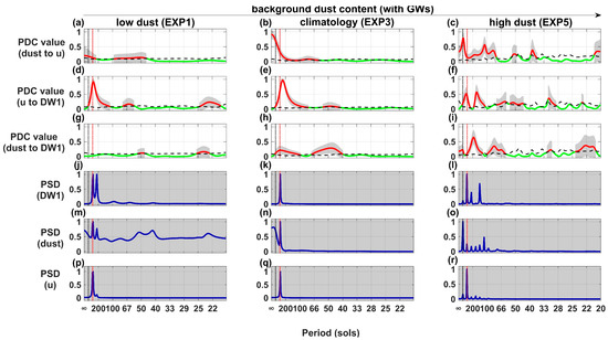 The distribution of PDC values and PSD in the frequency domain in Experiments 1 (left), 3 (center), and 5 (right) involving gravity waves. The sequence from top to bottom (a–c) shows the PDC values from dust to zonal winds (u); (d–f) illustrate the PDC values from zonal winds to the diurnal migrating tidal wave DW1; (g–i) depict the PDC values from dust to DW1; (j–l) display DW1’s PSD; (m–o) showcase the PSD of dust; (p–r) present the PSD of zonal winds. The data represented in these figures correspond to the averages within the areas of focus described in the experimental chapters. In the top three rows, red (green) lines indicate PDC values with (without) Granger statistical significance, with the shaded gray area representing the 99% confidence interval and the black curved dashed line marking the confidence lower limit. The bottom three rows feature blue lines for the PSD. Dashed vertical red and black lines denote semiannual and annual cycles, respectively.
