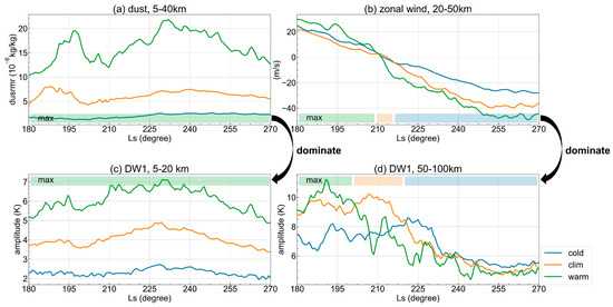 The zonal wind’s filtering effect on DW1 can be observed by comparing the activity of lower-level DW1 (Figure 5c) against upper-level DW1 (Figure 5d). The unfiltered lower-level DW1 is predominantly driven by dust radiative heating wave sources, as evidenced by the significant rise in the average DW1 amplitude with an increasing background dust content (‘Cold’: 2.3 K, ‘Climatology’: 4.1 K, ‘Warm’: 6.1 K) (Figure 5c). However, DW1 reaching the upper levels is primarily influenced by mid-level zonal winds, rather than solely by lower-level dust heating. Prior to Ls = 180°–270°, the ‘Warm’ scenario exhibits the strongest westerlies, thereby shifting the westward-propagating DW1 to the highest frequencies (Figure 3l), aligning closely with the sub-seasonal-scale dust’s intrinsic frequency (Figure 3o). Similarly, post-Ls = 210°, scenarios with the highest zonal wind speeds consistently correspond with the greatest DW1 magnitudes, as evidenced by the alignment of the maximum bars (ordinate axis labels) in Figure 5b,d.