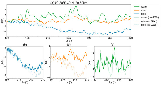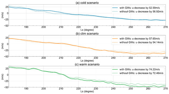 Numerical simulation results within the UTLM across 30°S–30°N for ‘cold’, ‘climatological’, and ‘warm’ scenarios, with/without gravity wave impacts. The legend indicates the change in zonal wind speeds from 180 Ls to 270 Ls.