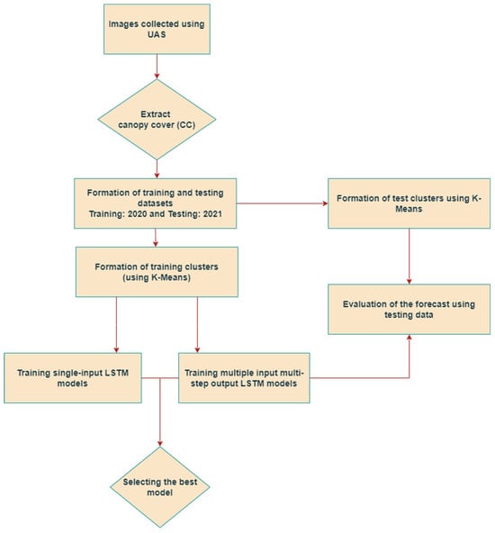 Before delving into the analysis, a schematic of the framework employed to forecast the CC values in this approach is presented in Figure 1. As depicted in the figure, images are gathered using a UAS for both the years 2020 and 2021. Subsequently, the CC is extracted utilizing Agisoft Metashape 1.7.2 software. Initially, the CC data for 2020 is clustered using the K-means algorithm and then utilized to train the LSTM models. Similarly, the CC data for 2021 serves as the testing dataset after clustering the plots with the K-means algorithm. The model with the lowest testing root mean squared error (RMSE) for forecasting CC values 14 days in advance was selected as the best model.