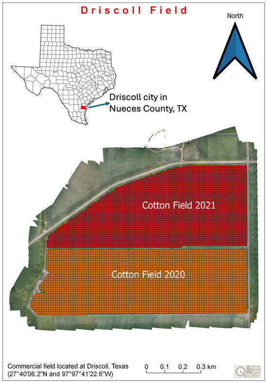 UAS data were collected from an 80.16 hectares commercial field located at Driscoll, Texas (27°40′06.2″N and 97°97°41′22.6″W). The field is divided into two halves and follows a cotton–sorghum rotation (Figure 2).