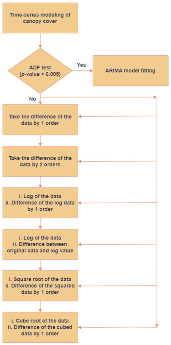 Contrary to the LSTM models that have been described before, it was imperative to ensure the stationarity of the dataset before using an ARIMA model for analysis. A rising trend component was noted in the values of the CC. Consequently, efforts were undertaken to eliminate non-stationarity from the time-series dataset by implementing six distinct procedures, as seen in Figure 3. The stages were executed in a sequential manner, and the p-value was computed after each step until the time-series data achieved stationarity (p-value < 0.005). The stationarity of the time-series data was verified by the application of the augmented Dickey–Fuller (ADF) test.