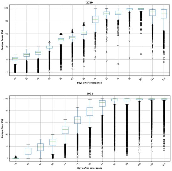 In Figure 4, the box plot illustrates the CC data recorded using drone imagery. The x-axis represents “Days after emergence”, while the y-axis represents “CC (%)”. Each box plot, corresponding to the years 2020 and 2021, depicts the interquartile range, i.e., the difference between the first and third quartiles for each day after emergence. Additionally, the black dots signify outliers within the dataset.