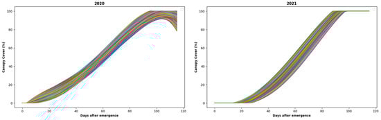 Given that the data were gathered over 14 days at irregular intervals, spanning from emergence to harvest, it was impractical to rely on the data from those specific days for analysis solely. Hence, considering the data’s distribution, as evident from the box plots, the approach was taken to employ a five-degree polynomial interpolation [] to interpolate the canopy data for both 2020 and 2021. This interpolation process provided enough data for all the plots throughout the 116-day growth period to design the predictive approaches. The distribution of the interpolated canopy data was visualized and is depicted in Figure 5. The interpolated canopy data from emergence to harvest has been shown in different colors to show how the distribution of the data varied over the plots.