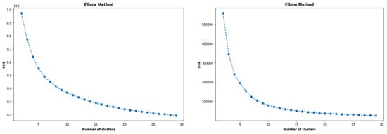 Before training the LSTM models, the data recorded for 2020 were clustered using K-means for ease of computation. Utilizing the elbow method, the optimal number of training clusters was determined to be 14, as the sum of squared errors (SSE) reached a plateau. Similarly, to assess the effectiveness of the trained LSTM models, the data for the year 2021 underwent clustering using the K-means algorithm. This process also resulted in choosing 14 as the optimal number of clusters. Subsequently, the selection of the best forecasting model was based on a majority vote, considering the model capable of forecasting future CC values with a minimal root mean square error (RMSE) across the majority of the testing clusters. Figure 6 illustrates the results of the elbow method employed as a metric to ascertain the optimal number of training and testing clusters.