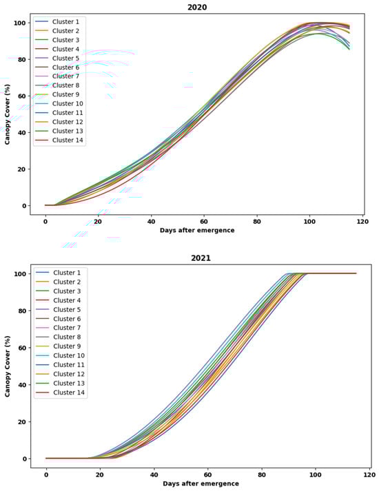 Before fitting the LSTM models to the data, it was imperative to divide the plots into similar clusters for ease of training and validation of the LSTM models. Since the CC data were obtained for 3500 grids for 116 days, it was not possible to train the LSTM models, considering all the time-series sequences, as it would have resulted in millions of training sequences. Having a huge amount of training sequences would have led to a much slower computation time, and due to hardware constraints, it was decided to cluster the grids with similar CC values using the K-means algorithm. As the K-means algorithm is relatively fast and computationally efficient for high-dimensional data due to its linear time complexity, it was used because it helps us provide more control over the granularity of clustering. The continuous time-series data for all the 3500 grids for 2020 and 2021 were grouped into 14 distinct training and testing clusters, respectively, taking the data until the 116th day after emergence (DAP) into consideration. The number of plots which were grouped into each of these 14 clusters for both the years 2020 and 2021 have been shown in Table 2.