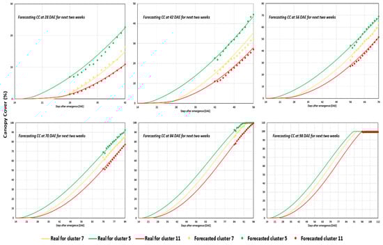 Bi-weekly prediction of CC from the growth period of four weeks to the end of the cultivation period (14-day prediction) for clusters 11, 5, and 7 (top to bottom).