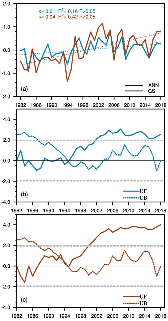 (a) The annual variations of the annual (ANN) and growing season (GS) mean SPEI averaged over the TP in 1982–2018; (b,c) are the M–K test for the annual and growing season mean SPEI, respectively. UF and UB in (b,c) represent upward fluctuation and downward fluctuation, respectively. The dashed lines represent the significance level threshold at the