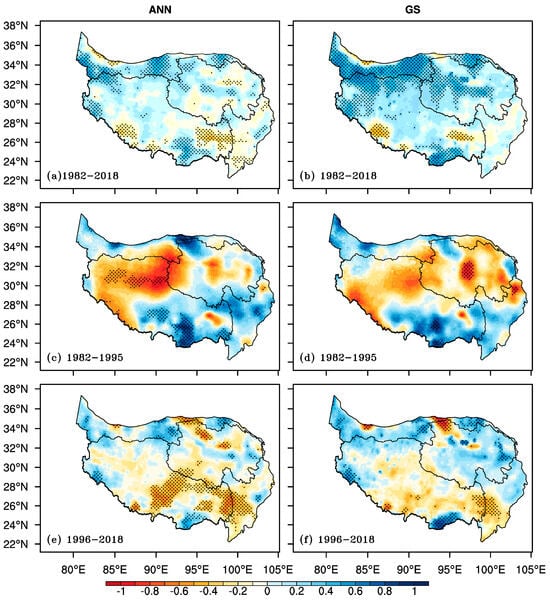 The spatial distribution of the linear trends for the annual and seasonal SPEI in (a,b) 1982–2018, (c,d) 1982–1995, and (e,f) 1996–2018; (a,c,e) are for the annual (ANN) SPEI and (b,d,f) for the growing season (GS) mean SPEI. The shaded areas indicate that the trend passes the significance test at the 99.9% significant level.