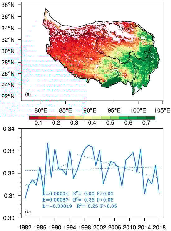 (a) The spatial distribution of the mean annual NDVI, and (b) the annual variation of the mean NDVI averaged over the TP in growing season during 1982–2018.