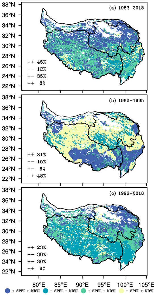 Figure 6 shows the correspondence linkage between the trends for the NDVI and SPEI in the growing season, further exploring the effect of changes in the SPEI on the NDVI. In the period of 1982–2018 (Figure 6a), 45% of the TP experiences a rising trend in the NDVI along with an increased SPEI trend, primarily in the northern TP. On the other hand, 12% of the TP located in the southeastern regions experiences a declining NDVI trend along with a declined SPEI. This indicates that the vegetation becoming better in most parts of the TP, especially in the northern and western parts, is largely due to the wetting trend, and the degradation of vegetation in most parts of the southeastern TP is induced by the drying trend in 1982–2018. Therefore, the areas where changes in the SPEI have an effect on the NDVI account for 57% of the TP. In approximately 43% of the TP, mainly in the southern regions, there is a poor relationship between NDVI and SPEI trends. This indicates that wetting and drying trends are not the main factor influencing vegetation growth in these regions.