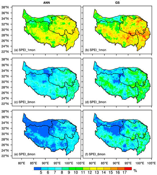 The spatial distribution of the drought frequency calculated at the (a,b) 1-month-, (c,d) 3-month-, and (e,f) 6-month-timescale SPEI. (a,c,e) are for annually (ANN) and (b,d,f) are for the growing season (GS) in 1982–2018.