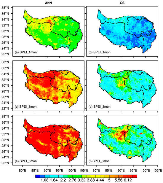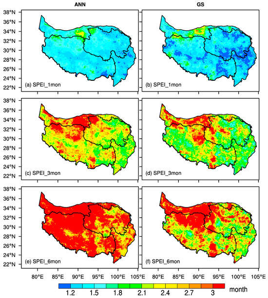 The spatial distribution of the drought duration calculated through (a,b) 1-month-, (c,d) 3-month-, and (e,f) 6-month-timescale SPEI. (a,c,e) are for annually (ANN) and (b,d,f) for the growing season (GS) in 1982–2018.
