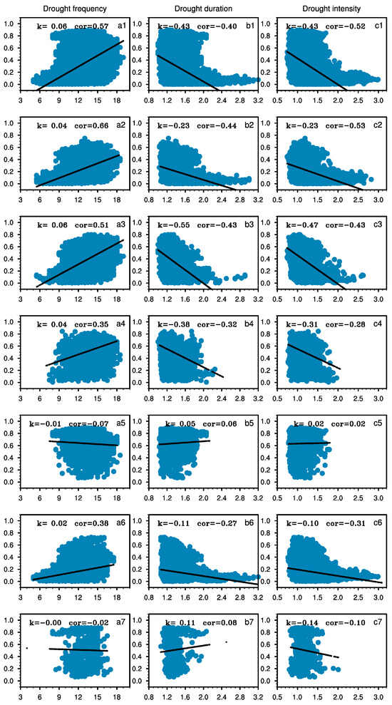 Relationships between NDVI of different vegetation types and their corresponding (a1–a7) drought frequency, (b1–b7) drought duration, and (c1–c7) drought intensity over the TP. (a1–c1) are for all the vegetation, (a2–c2) are for the sparse vegetation, (a3–c3) are for the meadow, (a4–c4) are for the shrub, (a5–c5) are for the forests, (a6–c6) are for the steppes, and (a7–c7) are for the croplands. cor represents the correlation coefficient between NDVI and drought characteristics.