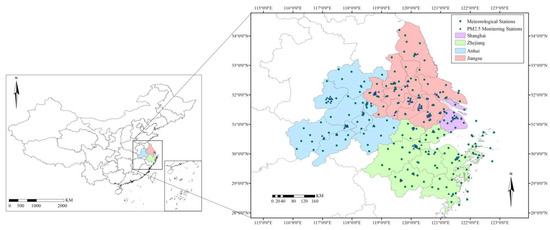 Wind direction (WD, °), wind speed (WS, m/s), air temperature (TMP, °C), dew point temperature (DPT, °C), and sea-level pressure (PRS_sea, hPa) were 5 meteorological variables used in this research. The hourly data from 2020 to 2022 were downloaded from the National Climatic Data Center (NCDC) affiliated to the National Oceanic and Atmospheric Administration (NOAA) of the United States (https://www.ncei.noaa.gov, accessed on 1 January 2023). The data were hourly or triple-hourly. We filtered the data across China and achieved the data over the YRDUA. There were 187 stations, which are shown in Figure 1. All 5 meteorological feature values are the mean values in an hour. The meteorological data were marked by longitude and latitude and matched with air quality data through Kriging interpolation. Following up was the temporal forward fill of the missing values (using the nearest value forward in time to fill the missing value).