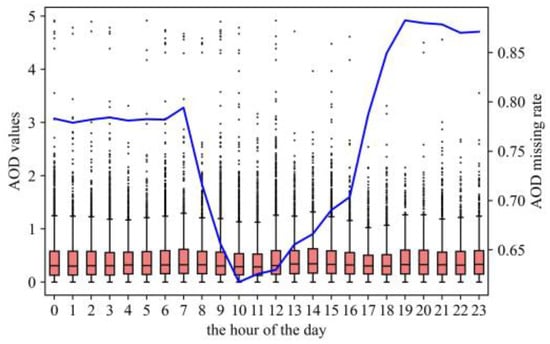 The boxplot and the missing rate of AOD values (the blue line) for different hours of a day. The left y-axis is the axis of the boxplot, while the right y-axis is the axis of the AOD missing rate line.