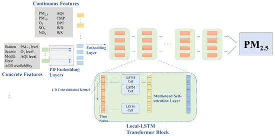 In PM2.5 forecasting tasks, common features, including meteorological variables and air quality variables, are continuous numerical data. However, the formation of PM2.5 highly relies on some non-numerical classification features or numerical regression features. Compared to those normal numerical-input models, PD-LL-Transformer included eight concrete classification features: station, season, hour-of-the-day, month-of-the-year, AOD availability, current PM2.5 level, current O3 level, and current AQI level. Among these features, station enables the model to extract spatial information of the model, and season, month-of-the-year, and hour-of-the-day represent temporality. PM2.5 level, O3 level, and AQI level are regulated by the Ambient Air Quality Standards [55] and Technical Regulation on Ambient Air Quality Index (on trail) [56] issued by the Ministry of Environmental Protection of the People’s Republic of China. As is mentioned in Section 2.2.2, satellite AOD is strongly correlated with PM2.5 concentrations, but the availability of AOD data is challenging. Therefore, PD-LL-Transformer takes AOD availability as an extra binary classification feature on top of simply using continuous AOD values. For data points whose AOD value is missing, its AOD value is replaced by zero, and its AOD availability is set different from other data points with correct AOD value. Since real AOD values range from 0 to 1, there is no need to standardize the AOD values. This novel process empowers the model to learn both the AOD information to influence PM2.5 concentrations and the scenarios when the AOD value is missing.