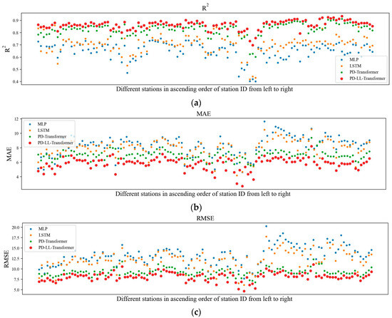 (a) R2, (b) MAE, and (c) RMSE for the four models at all individual stations in the test set. The points that indicate performances of PD-LL-Transformer are bold in red.