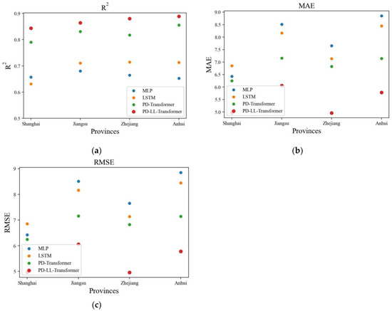 (a) R2, (b) MAE, and (c) RMSE for the four models at four provinces in the test set. The points that indicate performances of PD-LL-Transformer are bold in red.