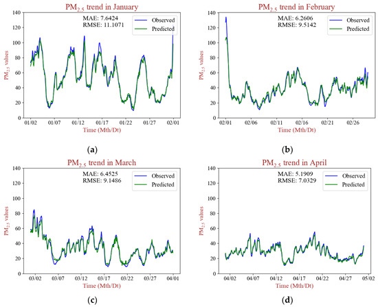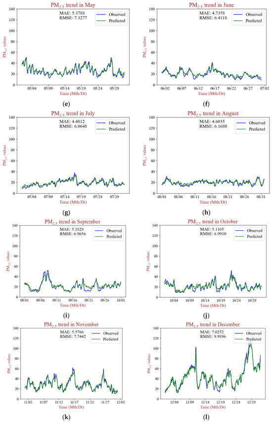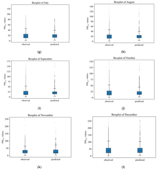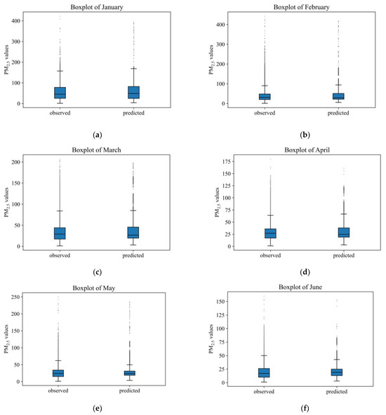 In addition, Figure 8 shows the boxplots of the observed PM2.5 concentration values and the predicted PM2.5 concentration values for each month in 2022. It could be drawn from the plots that, in each month, the observed values and the predicted values roughly follow similar distributions, demonstrating high levels of fit.