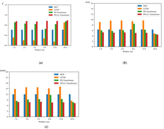 The basic procedure of the research was based on using data from the past 24 h to predict the scenario in the next hour. The size of the window text was set based on experience. To better generalize the model and enhance the persuasiveness of the model’s advantages, we performed experiments on different window sizes (1 h, 2 h, 3 h, 6 h, and 12 h). Except MLP, which always only took the information at the last timestep as the model input, LSTM, PD-Transformer, and PD-LL-Transformer, all as the time-series model, learned different temporal information given sequences with different timesteps.