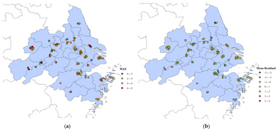 Figure 10 shows the distribution map of prediction bias and absolute error over the stations from PD-LL-Transformer. It could be drawn from Figure 10a that the MAEs of most stations range from 4 µg/m3 to 6 µg/m3, which are at low levels overall and consistent with the overall predictive effect of the model. According to Figure 10b, the mean residuals of most stations are close to 0, showing that PD-LL-Transformer has good forecasting ability for PM2.5 concentrations over the YRDUA.