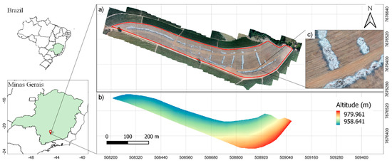 The study region comprised an area of 8 hectares intended for coffee cultivation (Figure 1). It was in Santo Antônio do Amparo, Minas Gerais, Brazil, at the coordinates 21°00′55.55″S e 44°54′57.75″W. The regional climate is characterized as hot and temperate. The regional climate is warm and temperate, with annual average temperatures between 20 and 22 °C, yearly rainfall between 1300 and 1600 mm, and altitudes between 800 and 1000 m [24].