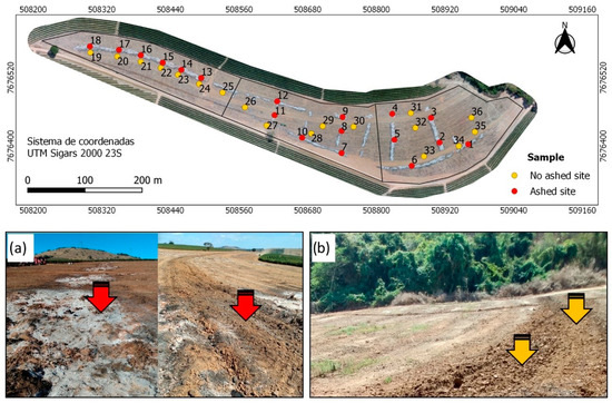 Samples were taken in two distinct regions (natural soil and soil with ash present) at a depth of 0–0.20 m. The area was divided into three sampling blocks. Each block comprised six ash samples and six natural soil samples, totaling thirty-six samples (Figure 2).