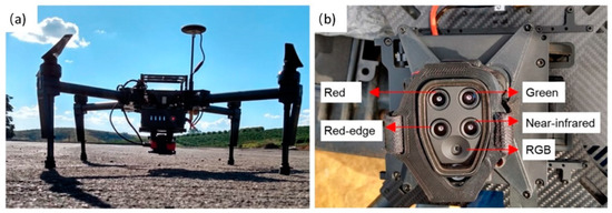 (a) Remotely Piloted Aircraft DJI Matrice 100, (b) Parrot Sequoia multispectral camera.