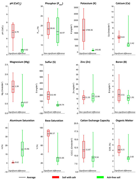 The collected samples were sent to a soil analysis laboratory to determine Mg, Al, Ca, Mg, K, B, Zn, S, and P; cation exchange capacity (CEC); soil pH; organic matter; and base saturation. These results were subjected to statistical analysis to verify the degree of interference of ash deposits on soil nutrient availability.