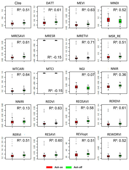 The analysis presented in Figure 7 demonstrates that vegetative indices with low correlations between Ash-on and Ash-off areas can be considered the best ones to differentiate these areas. As shown in Figure 7, the Normalized Near Infrared Index (NNIRI) and Normalized Green Index (NGI) present the best R2 results: 0.13 and 0.07, respectively. NGI index application was demonstrated in the research by Garba et al. [47], evidencing the ability to differentiate pasture growth at different stages, with green band presence in the NGI and NNIRI indices pointing to changes in the chlorophyll. According to Gitelson et al. [48], bands selected in GREEN, RED, and RE presented chlorophyll absorption features that can be used to determine the content of leaf chlorophyll with the modified chlorophyll absorption reflectance index. Analyzing Figure 6, it is possible to observe that changes in leaf color in regions with ash deposits correlate with better vegetative index performance using the green band.