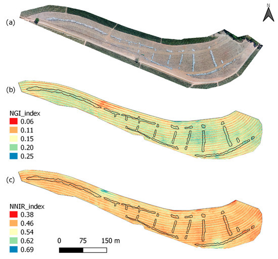 Monitoring by NGI and NNIRI indices in coffee plants with four months of planting: (a) ash location (RGB), (b) NGI index, and (c) NNIRI index.