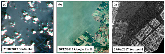 Traditional statistical methods relied on manual surveys or vessel-based global positioning system (GPS) measurements [8]. This method is feasible and offers high accuracy for small-scale aquaculture areas. However, when dealing with large-scale aquaculture lakes or coastal farming regions, acquiring accurate and reliable results becomes challenging [1]. Moreover, these methods lack the capability to trace the historical records of aquaculture activities. With the rapid development of remote sensing techniques, the cost-effectiveness and high efficiency of satellite remote sensing have rendered it particularly valuable for monitoring aquaculture facilities. Amid growing concerns about the environmental impact of aquaculture, a variety of optical satellite data sources, such as Landsat5/8, Sentinel-2, and China’s satellites ZiYuan-3 and Gaofen-1, have been employed to map aquaculture facilities [9,10,11]. However, as shown in Figure 1a, optical remote sensing data are affected by factors such as cloud cover, lighting conditions, and atmospheric interference, limiting monitoring capability to monthly or more frequent time scales. Additionally, net-pen aquaculture structure is often below the resolution of these optical images, making it difficult to directly extract from these images. Although higher-resolution images may potentially overcome this limitation (see Figure 1b), they are still generally expensive or difficult to acquire. Compared to optical images, net-pen aquaculture structures are clearly visible in SAR images even in cloudy or rainy weather (see Figure 1c). As more SAR data become available, using SAR data for more effective and high-frequency monitoring of the net-pen aquaculture dynamics becomes possible.