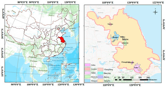 Our research was focused on Jiangsu Province, which is one of the provinces with the highest concentration of shallow lakes in China. Since the 1980s, driven by economic interests, large-scale aquaculture activities have emerged in the shallow lakes of Jiangsu Province. The continuous expansion of aquaculture area has led to a rapid increase in aquaculture density, which peaked in the early 21st century. This poses a severe challenge to the restoration of lake ecosystem functions, with water quality issues becoming increasingly prominent. In 2018, under the call of China’s “river and lake chief system” policy, Jiangsu Province put forward the “Jiangsu Provincial Lake Protection Regulations”, dividing 13 lakes under provincial management. Taking into full consideration of multiple factors such as policy influence, geographic location, area size and distribution of water systems of lakes in Jiangsu Province, China, as shown in Figure 2 we selected eight lakes as typical lakes, namely, Luoma Lake, Hung-tse Lake, Gehu Lake, Gaoyou Lake, Taihu Lake, Changdang Lake, Baoying Lake and Baima Lake, to study the changes of net-pen aquaculture in shallow lakes in Jiangsu Province.