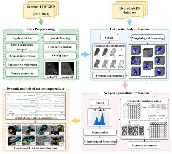 The workflow of our study is shown in Figure 3 and elaborated upon in the following sections. It consists of four main steps: (1) data preprocessing; (2) lake water body extraction; (3) net-pen aquaculture extraction; (4) dynamic analysis of net-pen aquaculture.