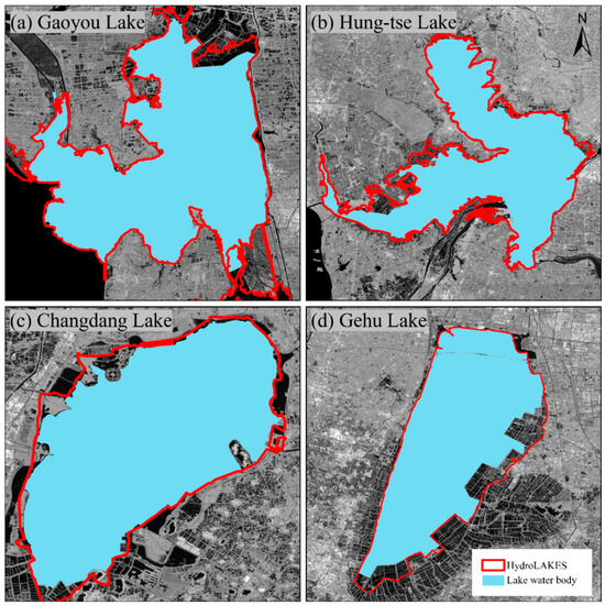 Owing to the presence of numerous aquaculture ponds along the shores of shallow lakes in Jiangsu, China, the lake polygons offered by the HydroLAKES database usually incorporate some aquaculture ponds. This leads to the polygons encompassing a larger area than the actual lake surface required for our study. In our study, we utilized the HydroLAKES lake database to locate the lakes in the study area and subsequently performed lake surface extraction, excluding the aquaculture ponds sections from the lake area.