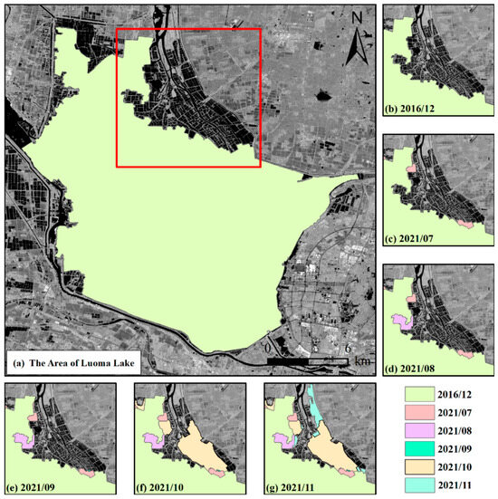 Illustration of Luoma Lake’s area change: (a) highlights recent alterations in the lake, and (b–g) depicts months with significant area changes from 2017 to 2021.