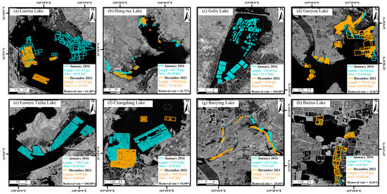 The spatial distribution changes of net-pen aquaculture range of the studied lakes between January 2016 and December 2021 are depicted in Figure 7. It can be observed that all the net-pen aquaculture has been removed from both Gehu Lake and Eastern Taihu Lake. Substantial changes were also found for Changdang Lake, Luoma Lake, Hung-tse Lake and Baoying Lake. Taking Luoma Lake for example, in January 2016, the total net-pen aquaculture area and fence length were 28.92 km2 and 201.02 km, respectively. These values decreased to 11.14 km2 and 123.52 km, respectively, in December 2021. And from Figure 7a, we can see that more than half of the net-pen aquaculture has been removed, especially in the east of the lake. However, no observable changes were noted in the distribution of net-pen aquaculture in Gaoyou Lake and Baima Lake between 2016 and 2021.