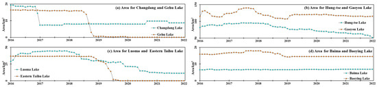 Monthly dynamic change analysis of the net-pen aquaculture area of the study lake: (a) is area for Changdang Lake and Gehu Lake; (b) is area for Hung-tse Lake and Gaoyou Lake; (c) is area for Luoma Lake and Eastern Taihu Lake; (d) is area for Baima Lake and Baoying Lake.