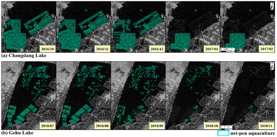 In this study, we employed Sentinel-1 SAR images to analyze the spatial distribution and changes in the net-pen aquaculture in representative shallow lakes in Jiangsu Province on a monthly basis. The results of this study validate the possibility of using SAR for extracting net-pen aquaculture structures in lakes include a dataset on the distribution and dynamics of net-pen aquaculture areas in shallow lakes of different sizes in Jiangsu Province, China and provide valuable lessons for other inland lakes experiencing aquaculture development and net-pen aquaculture in shallow lakes in the coastal areas. With the availability of radar satellites with higher temporal and spatial resolutions, the dynamic monitoring of net-pen aquaculture structures in shallow inland lakes over denser time series can be realized with the framework extracted in this paper. The extraction and production of datasets through a larger scale of the extent of purse seine aquaculture in shallow lakes can provide data support for policy development.