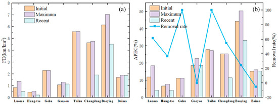 The initial, maximum, and recent values of the lake net–pen aquaculture in the research sequence of FD and APEC coefficients. The line graph represents the removal rate of each lake; (a) displays the initial, maximum, and recent FD values for various lakes; (b) on the primary vertical axis shows the initial, maximum, and recent APEC values for the lakes, and the secondary vertical axis indicates the removal rate of net–pen aquaculture.