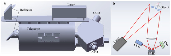 Structure and optical path diagram of the LiDAR system. (a) The system features three main components: the laser system, a Schmidt–Cassegrain telescope, and a dual-channel optical reception system. (b) Schematic diagram of the system’s optical path. The light emitted by the laser system illuminates the object under measurement, and the returned light, collected by the telescope, is projected onto the DMD. After modulation with the DMD, one path is directed to the APD to obtain the total intensity, while the other path is received and imaged using the CCD.