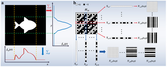 The principle of projection curve measurement. (a) The projection curves of a slice image of the 3D scene. (b) The generation process of modulation patterns, where each row and column of the Hadamard matrix is utilized to construct a modulation pattern. For example, the first row of the Hadamard matrix Sx,1 is used to construct the modulation pattern S′x,1(x,y), and the first column S1,y is used to construct the modulation pattern S′y,1(x,y). The specific construction method involves setting each row of S′x,1(x,y) equal to Sx,1 and each column of S′y,1(x,y) equal to S1,y.